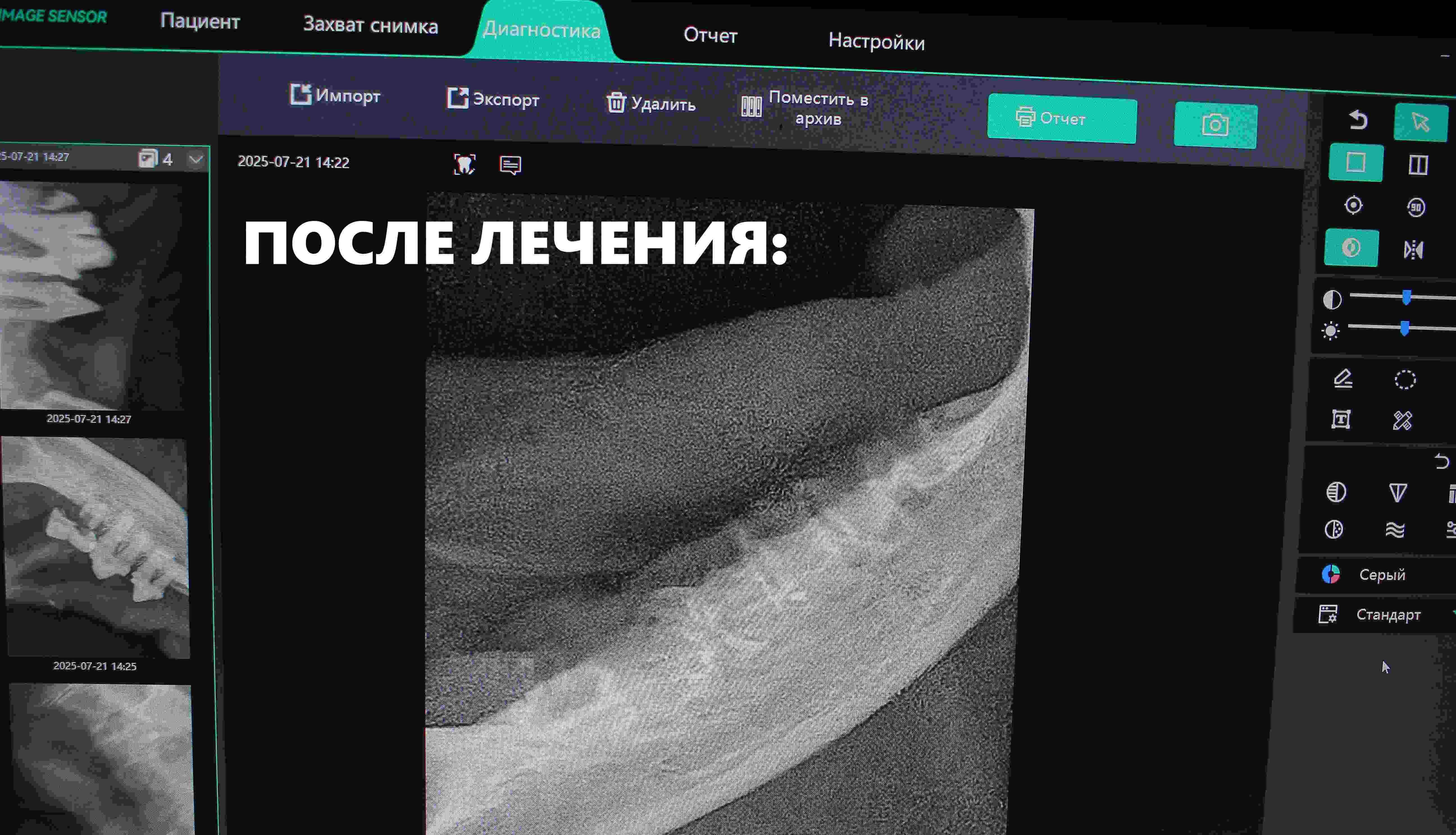 Дентальная визиография коренных зубов кошки, поступившей с жалобами на потерю аппетита и гнилостный запах изо рта. Диагноз: периодонтит 3 степени(утрата 40-50% костной ткани альвеолярного гребня), гингивит, одонтокластическая резорбция моляра 409. Периодонтит проявляется необратимым разрушением связочного аппарата, удерживающего зуб в альвеолярной лунке. Периодонтит 3-4 степени является очагом хронической инфекции и боли, в таких случаях возникает необходимость тотального удаления зубов.